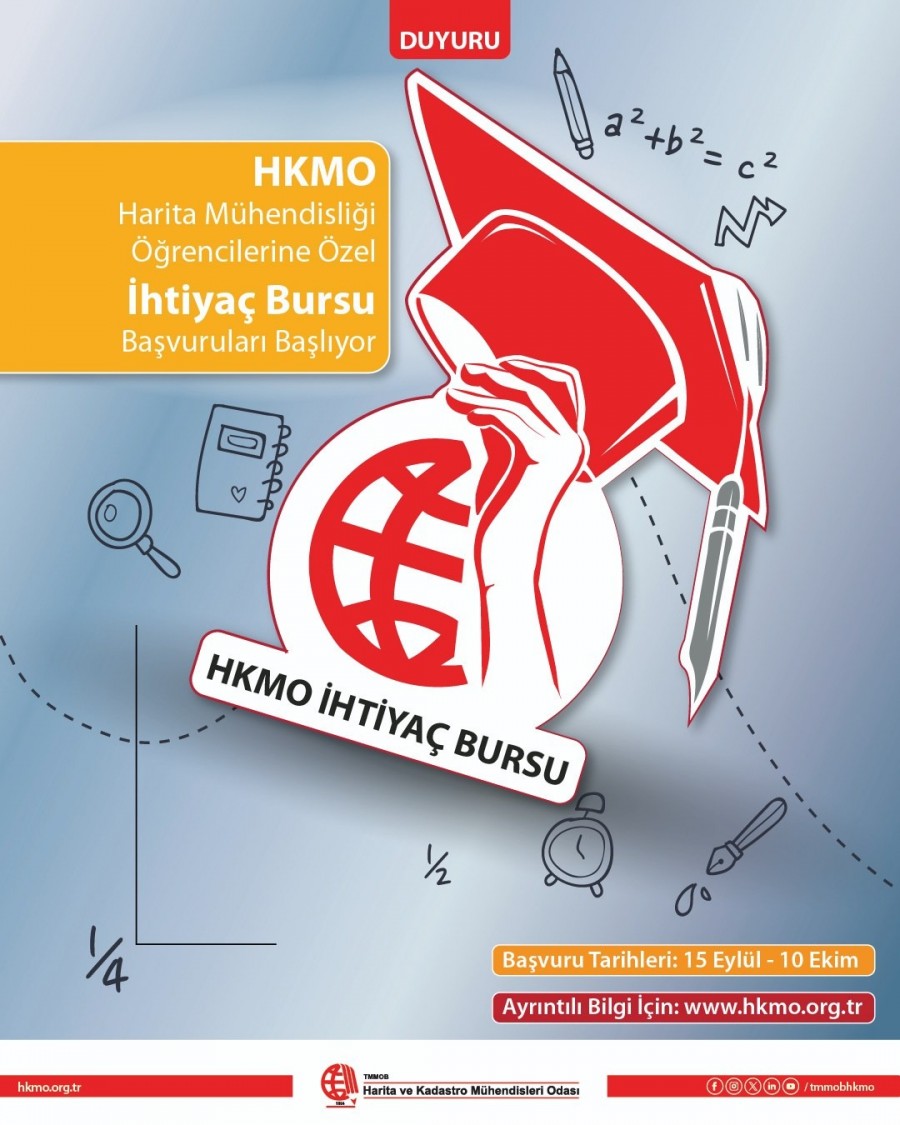 TMMOB Harita ve Kadastro Mühendisleri Odası Burs Yönetmeliği kapsamında 2022 yılından itibaren verilmeye başlanan HKMO İhtiyaç Burslarının 2025-2026 eğitim-öğretim yılına ilişkin başvuruları 15 Eylül 2025 tarihinde başlayacak olup 10 Ekim 2025 tarihinde sona erecektir. Harita Mühendisliği Lisans Bölümlerinde öğrenim gören, ailesinin ve kendisinin toplam gelir miktarı sadece zorunlu ihtiyaçlarını karşılayacak kadar olan ve başvuru sonrasında sunacağı belgeler ile ekonomik durumunun yeterli olmadığını belgeleyen 50 (elli) öğrenciye Odamızca aylık 4.500,00 TL (dörtbinbeşyüz TL) karşılıksız ihtiyaç bursu verilecektir.